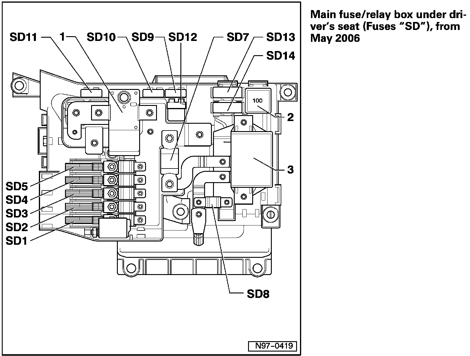 Main Fuse/Relay Box Under Driver's Seat (Fuses "SD"), From May 2006