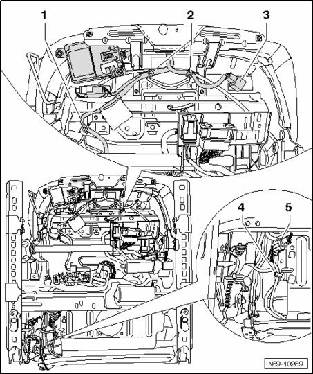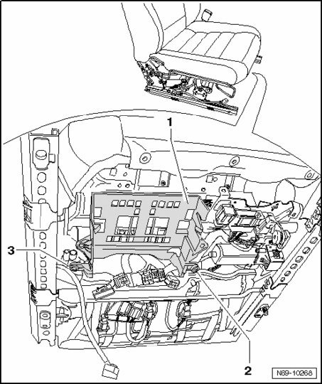 - Remove side hooks -1- and -2- outward and remove Memory Seat/Steering Column Adjustment Control Module J136 -3-from mounts.