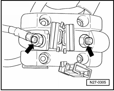 • When connecting battery, always perform work procedure as described in repair information --> [ Battery, with Auxiliary Battery or Two-Battery Layout, Disconnecting and Connecting ] Battery, with Auxiliary Battery or Two-Battery Layout, Disconnecting and Connecting. Not adhering to sequence will result in the deactivation of Main Battery Switch -E74- and subsequent damage to electrical system components.