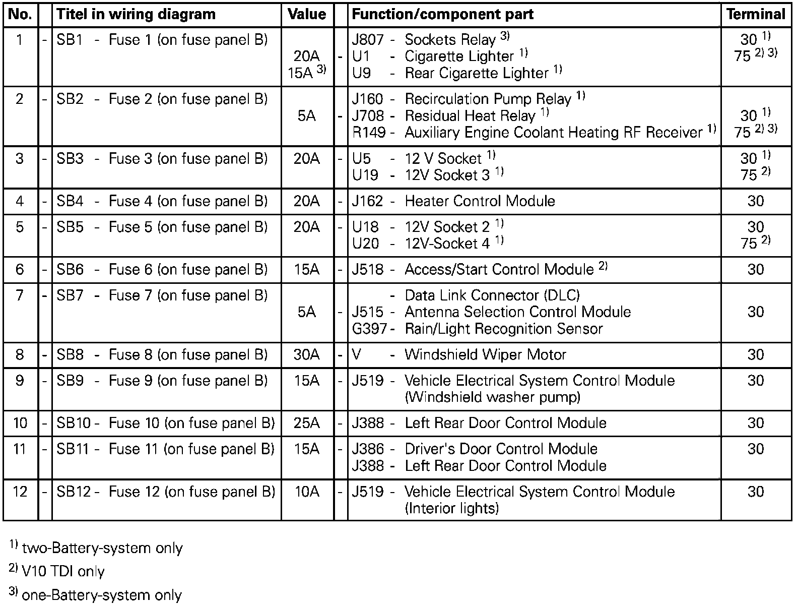 Fuses "SB" In Left Side Instrument Panel Fuse Box: