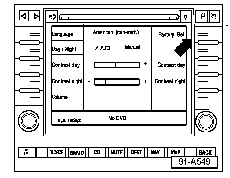 - Press and HOLD "Factory Set." soft key (arrow) for at least 6 seconds, until next screen appears.