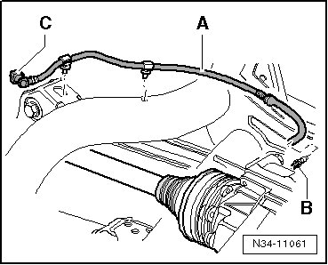 Part 1 of the breather line - A - runs from the breather connection - B - of the rear final drive over the subframe to connection - C -.