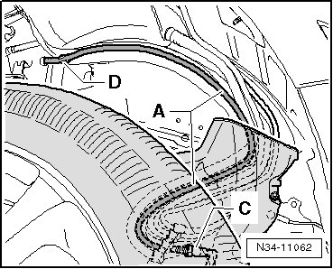 Part 2 of the breather line - A - is clipped under the fuel filler tube (- D -).