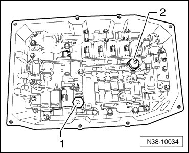 - Carefully pull off the connectors for automatic transmission hydraulic pressure sensor 1 (G193) - 1 - and automatic transmission hydraulic pressure sensor 2 (G194) - 2 -.