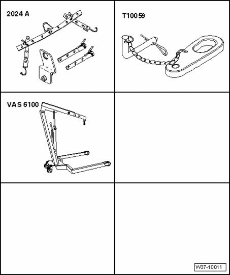 - Fasten engine sling 2024 A with shackle T10059 to shop crane VAS 6100 as shown in the illustration.