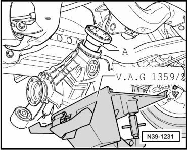 - Place engine and transmission holder (VAG 1383 A) with universal transmission adapter (VAG 1359/2) under the rear final drive.