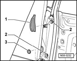 - Remove both bolts -1- from securing elements -2- of door window -3-.