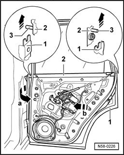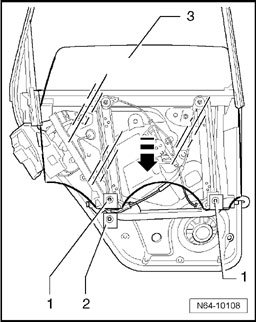 - Lift door window -3- out of securing elements -2- and pull the door window - 3 downward in - direction of arrow - out of window guide.