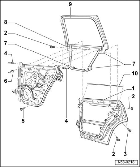 Entire door consists of outer door panel -1-, assembly carrier -6- and window frame -9-. When assembly carrier and window frame are joined together, it is referred to as a subframe.