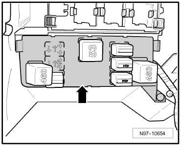 Below instrument panel driver's side, below relay carrier -Arrow-