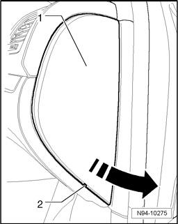 - Remove side cover -1- of instrument panel, do this by inserting trim removal wedge VAS 3409 or a screwdriver into recess -2- and pry off cover -1- in -direction of arrow-.