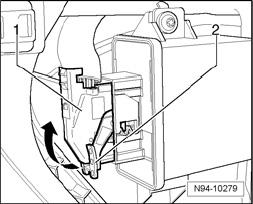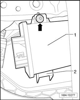 - Disengage securing bracket -1- in -direction of arrow- and disconnect harness connector -2- from Headlamp Range Control Module J431.