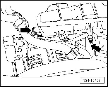 - Remove the coolant pipe and oil dipstick guide tube bolts - arrows - from the intake manifold.