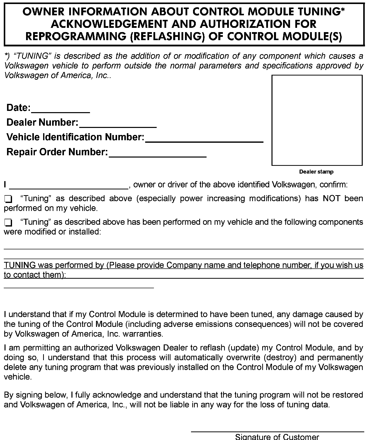 Your dealership should place the vehicle owner on notice in writing, that their ECM or TCM was found to have been tuned, and that any damage caused by the tuning of the ECM or TCM (including any adverse emissions consequences) will not be covered by Volkswagen of America, Inc. warranties.
