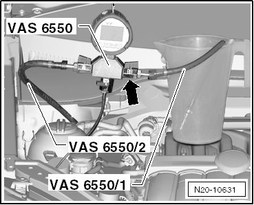 - Connect the pressure tester (VAS 6550) to the fuel supply line using the hose (VAS 6550/1). Hold the other end of the hose (VAS 6550/2) in a measuring container.