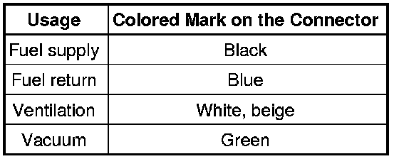 The connectors for the fuel, vacuum and ventilation lines are marked with colors. There is either a colored dot on the connector or the release button is the corresponding color.