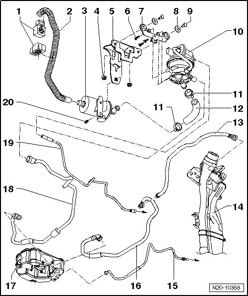 • Hose clip pliers (VAS 6340) or hose clip pliers (VAS 6362) are recommended for installing spring-loaded band-type clamps.
