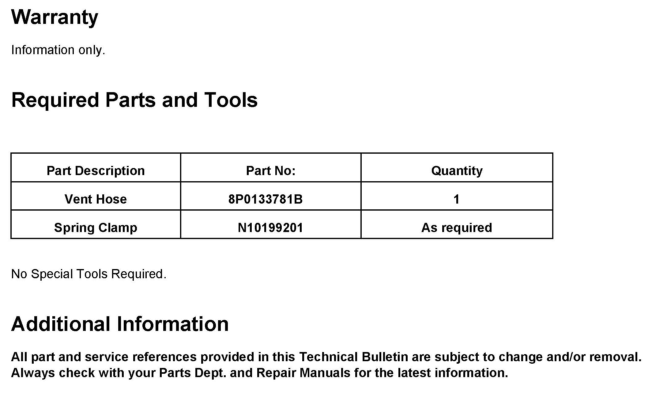 New design vent hose Part No. 8P0133781B for EVAP purge valve -N80- to improve EVAP system performance.