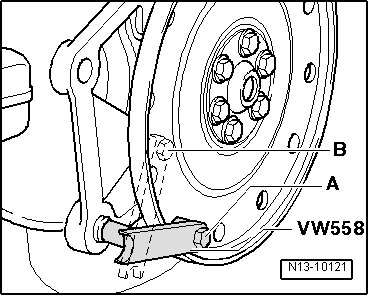 - Secure the flywheel lock adapter (VW 558) to the drive plate with the M8 x 45 bolt. Insert two M10 nuts between the flywheel lock adapter and the drive plate.
