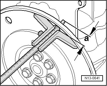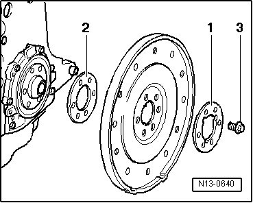 - Remove the drive plate and install the shim - 2 -. Tighten the bolts - 3 - again to 30 Nm.