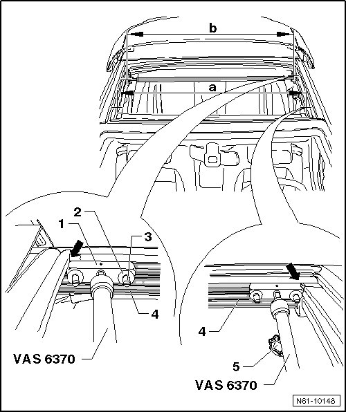 - Adjust guide rails according to front dimension - a - that was noted using Guide Rail Assembly Gauge (VAS 6370). Tighten the screw - 5 -.