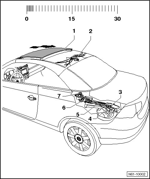 The glass panel - 1 - begins opening - arrow - via the electric drive motor - 2 - only after all the windows have lowered completely.