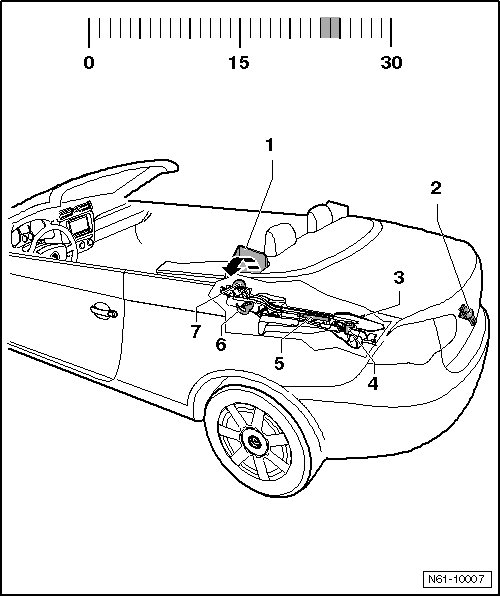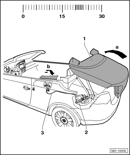 Hydraulic cylinder - 3 - moves main hinge - 2 - with entire roof for storage in luggage compartment - arrow a -.