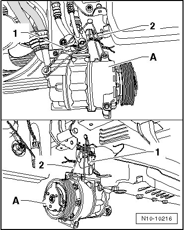 - Disengage the A/C compressor - A - at the lock carrier as shown (fasteners - 1 and 2 -).