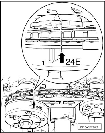 - The distance between the marks on the camshaft adjuster must be exactly 16 rollers of camshaft timing chain.