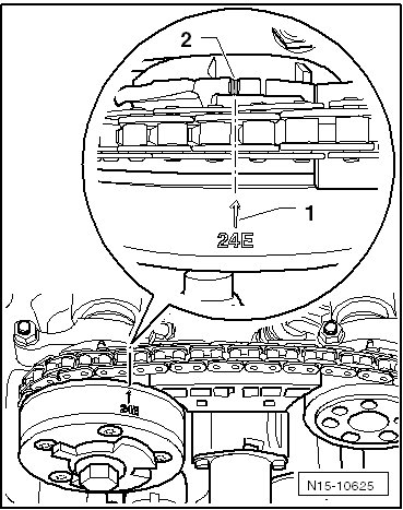 • The mark - 1 - on the camshaft adjuster for the exhaust camshaft, must align - arrow - with the left notch - 2 - on the control housing. Marks on the control housing, refer to => [ Marks on Control Housing ].