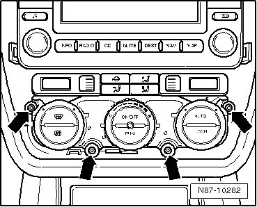 - Remove the screws - arrows - and the Front A/C display control head / Climatronic control module - 1 - from the center console.