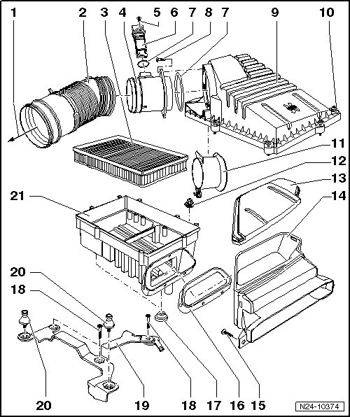 13 - Mass Air Flow (MAF) Sensor -G70- and Intake Air Temperature (IAT) Sensor -G42- => [ Air Filter Assembly Overview ] See Image Below. - integrated
