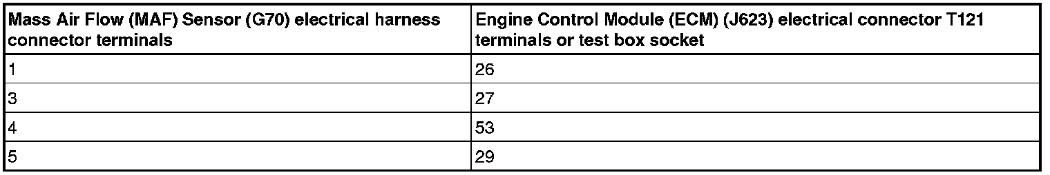 - Using a multimeter, check the Mass Air Flow (MAF) Sensor (G70) electrical harness connector terminals to the Engine Control Module (ECM) (J623) electrical harness connector T121 terminals for an open circuit.