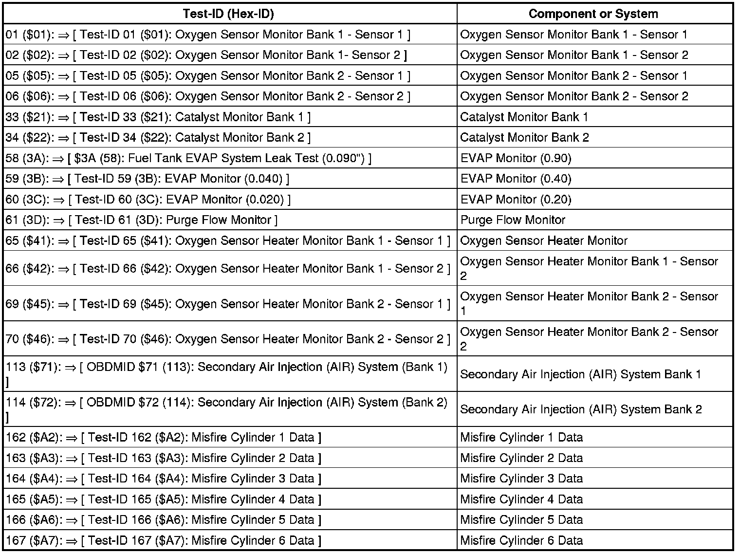 Depending on the scan tool and protocol used, the information displayed in Diagnostic Mode 06 may be referred to by different names such as Test-ID (TID), Hex-ID, Component-ID (CID), On-Board Diagnostic Monitor Identifier (OBDMID), or contain no name at all and may be referenced by only a number.