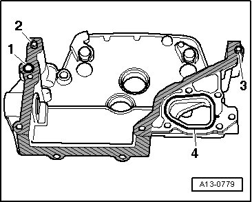 - Fill the 3 mm holes in the cylinder head gasket with sealant (D 176 501 A1). Apply sealant (D 176 501 A1) to the sealing surfaces on the cover and install the cover immediately.