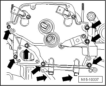 - Remove the camshaft front cover bolts - arrows -.