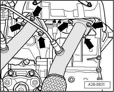 - Remove the front exhaust pipe to exhaust manifold nuts - arrows - accessible from the top.