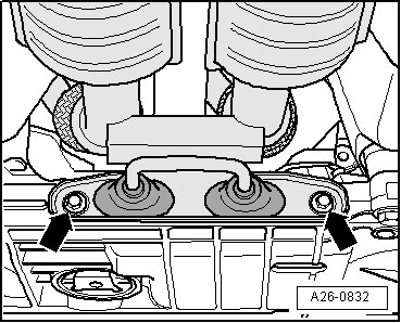 - Remove the front exhaust pipe to exhaust manifold nuts - arrows - accessible from the bottom.