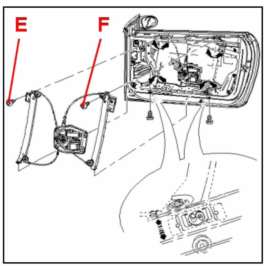 ^ Lower the door window till the two pinch bolts (C, D) are accessible through the opening.