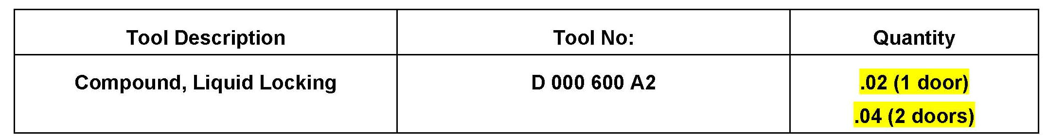 Secure the affected LH/RH Door pinch/mounting bolts with locking compound.