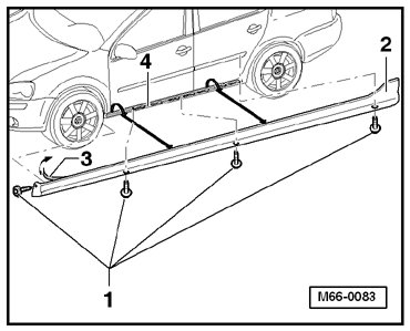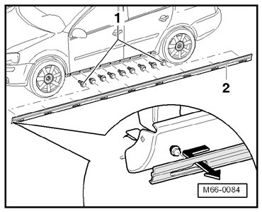 - Secure the front side of the side panel trim molding - 2 - with a bolt - 1 -. Tightening torque: 2 ±0.5 Nm.