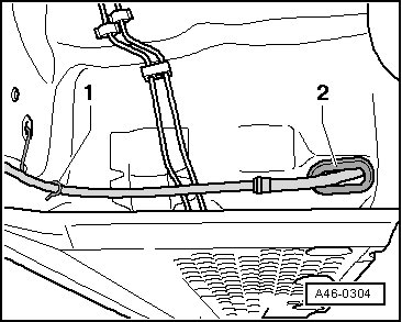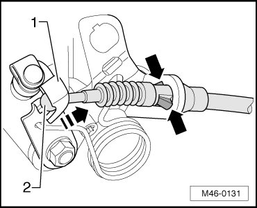 - Disengage parking brake cable from bracket - 1 - and pull hand brake cable out of guide tube - 2 -.