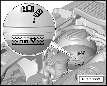 • Inspection service: coolant level above "Min. marking" - arrow -.