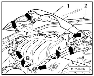- First place engine cover on to rear mounting points - arrows B -, then on to front mounting points - arrows A -.
