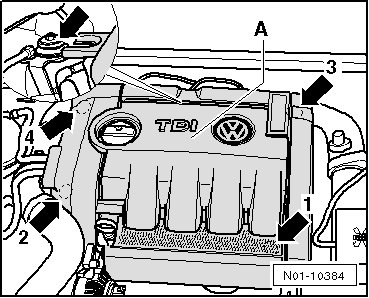 - Then position engine cover - A - on other fastening points - arrows 1 to 4 - and press on until you feel it engage.