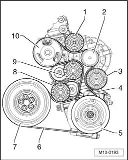 9. Tensioning roller for generator and coolant pump ribbed belt