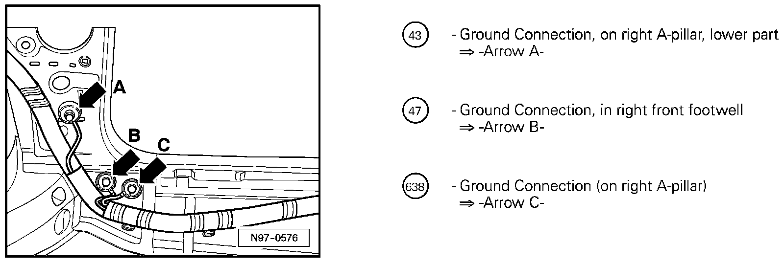 Ground Connection, On Right A-Pillar, Lower Part 43, Ground Connection, In Right Front Footwell 47, Ground Connection (On Right A-Pillar) 638: