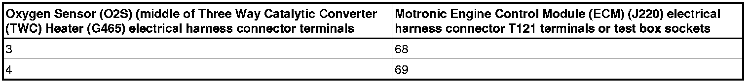 - Using a Multimeter, check the Oxygen Sensor (O2S) (middle of Three Way Catalytic Converter (TWC) Heater (G465) electrical harness connector terminals to the Motronic Engine Control Module (ECM) (J220) electrical harness connector T121 terminals for resistance.
