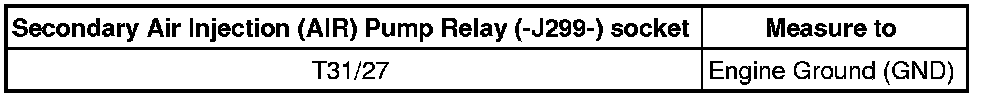 - Check the Secondary Air Injection (AIR) Pump Relay (-J299-) socket T31/27 to the Battery (A) for an open circuit or short to Ground (GND).