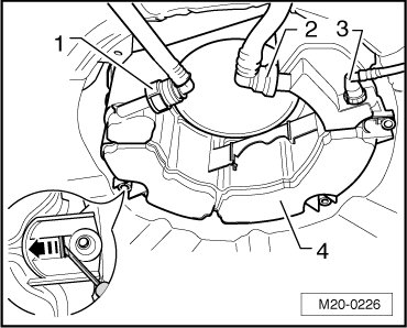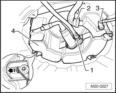 - Press the locking mechanisms on the bolt points in the - direction of the arrow - using a screwdriver and remove the Evaporative Emission (EVAP) canister - 4 -.